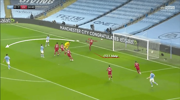 Есть много случаев, когда Александер-Арнолд поддерживал атаку и не успевал вернуться вовремя во время прорыва соперника. Это риск при игре с такими атакующими защитниками. И это едва не стоило им победы над «Сити», в то время как кросс Кевина Де Брюйна нашел Стерлинга на дальней штанге.