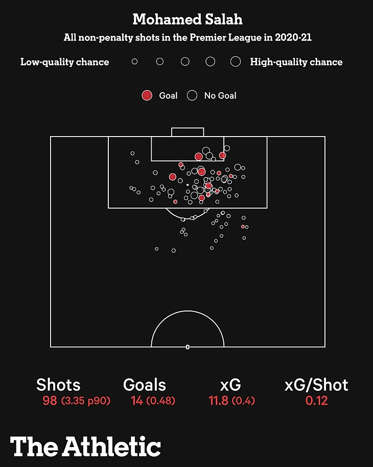 Салах в среднем совершает 3,4 удара за 90 и входит в топ-10 для любого игрока Премьер-лиги в этом сезоне. Как можно увидеть ниже, у него есть определенная область справа от штрафной, из которой он бьет своей любимой левой ногой.