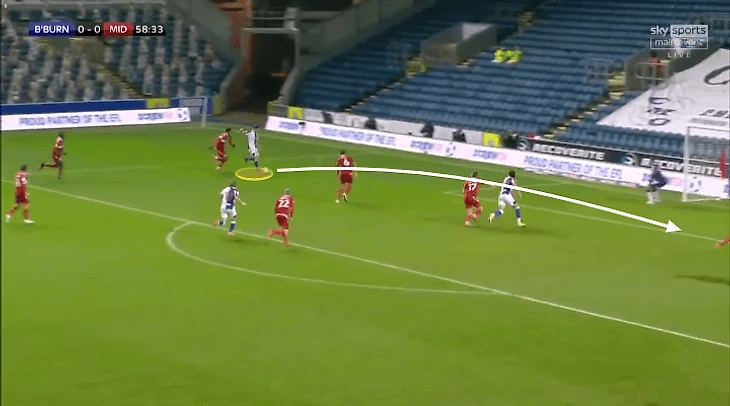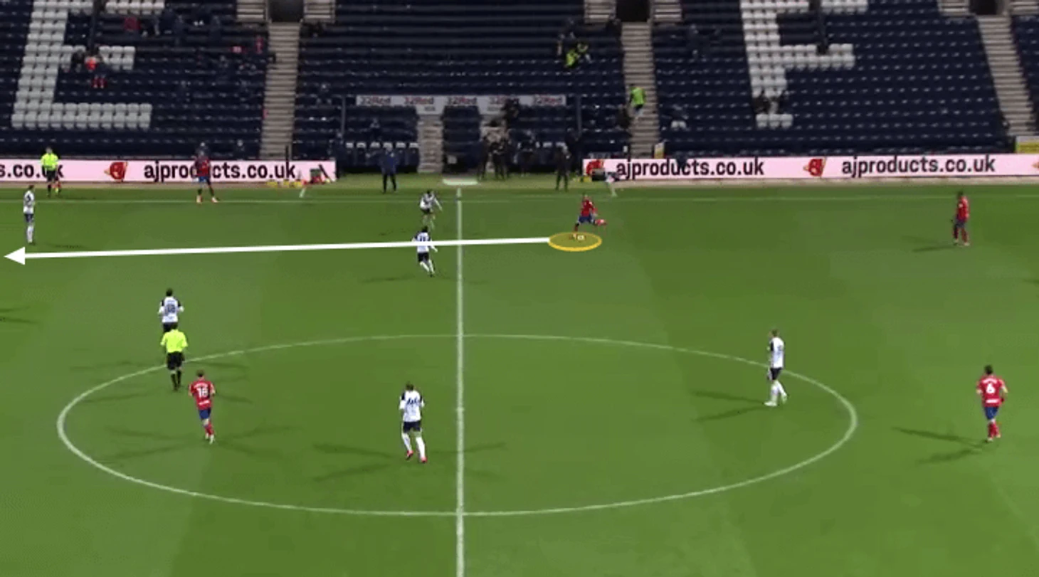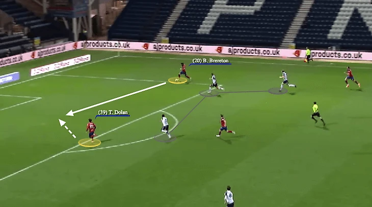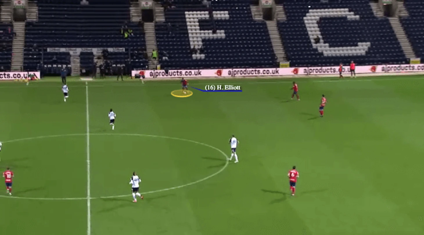 Тем не менее, Эллиот замечает забег Бена Бреретона (вне кадра) и разыгрывает нанизывающий пас, который пробивает две линии обороны «Престона», пуская Бреретона за спину защитникам.