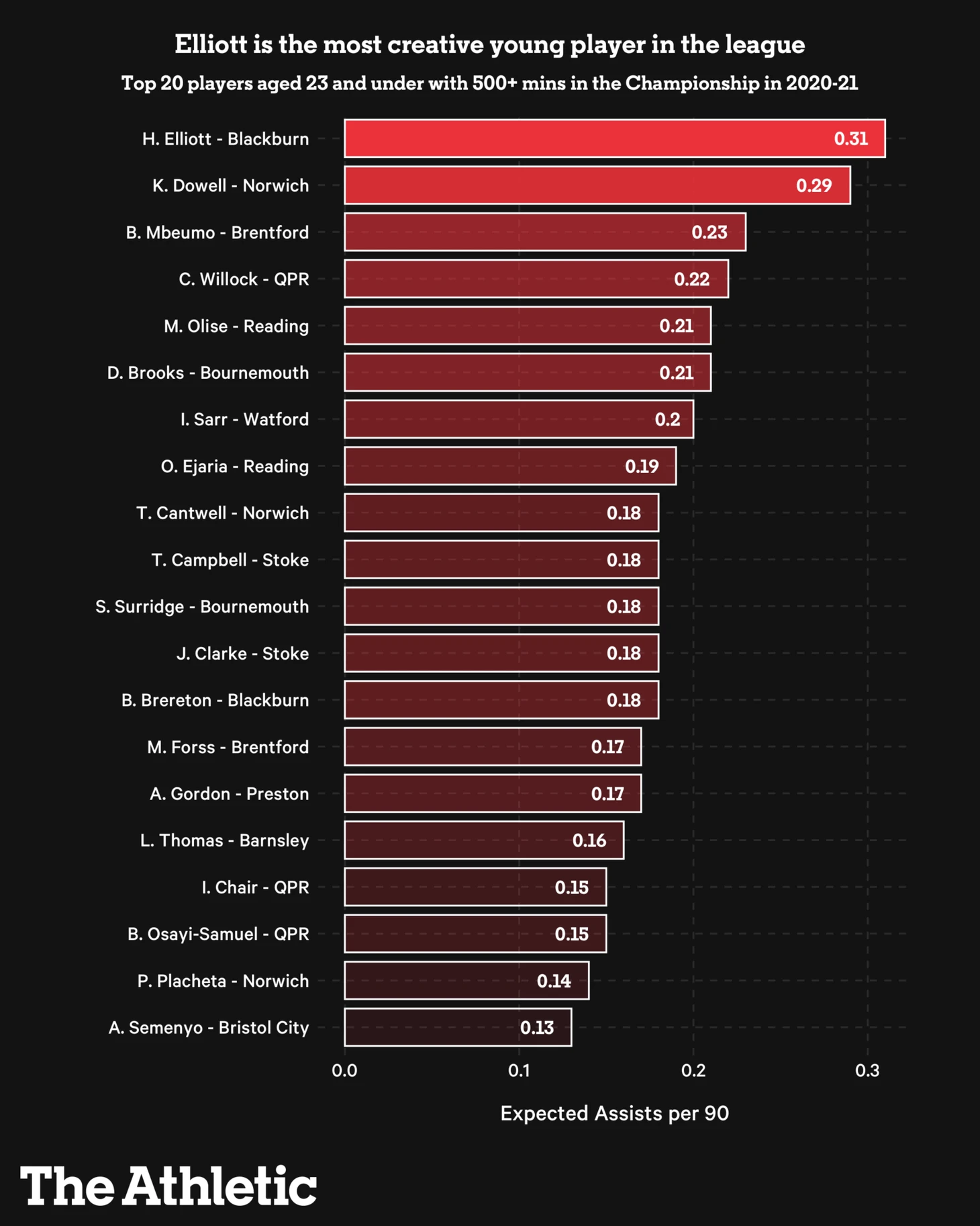 Глядя на весь Чемпионшип и их атакующих игроков в возрасте 23 лет и младше, Эллиот возглавляет список среди своих сверстников с 0,31 ожидаемыми передачами за 90 минут. Проще говоря, это означает, что по качеству его пасов будет ожидаться, что он сделает почти одну голевую передачу за три игры. Это немалый подвиг, особенно учитывая, что единственным другим подростком в списке топ-20 является атакующий полузащитник Майкл Олис из «Рединга» (0,21 на 90).