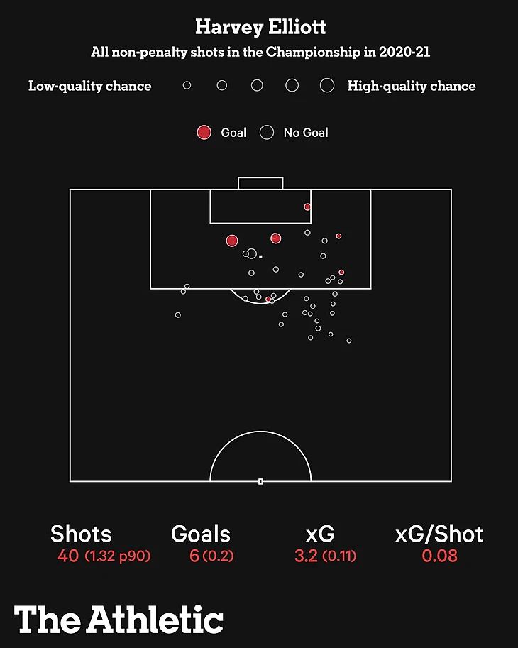 Итак, творческие качества Эллиота неоспоримы, но как насчет его стремления к голам? Его шесть голов без учета пенальти — достойная отдача, и он на самом деле превышает свои ожидаемые голы в 3,2 в этом сезоне. Тем не менее, он мог бы извлечь выгоду из того, чтобы время от времени становиться более эгоистичным в своей игре, поскольку он зачастую с большей вероятностью ищет пас, нежели удар.
