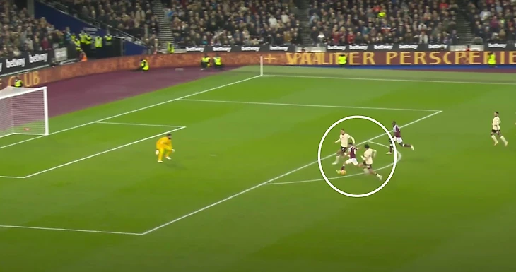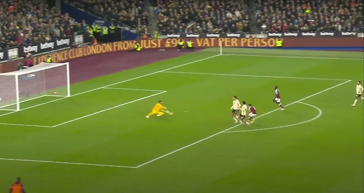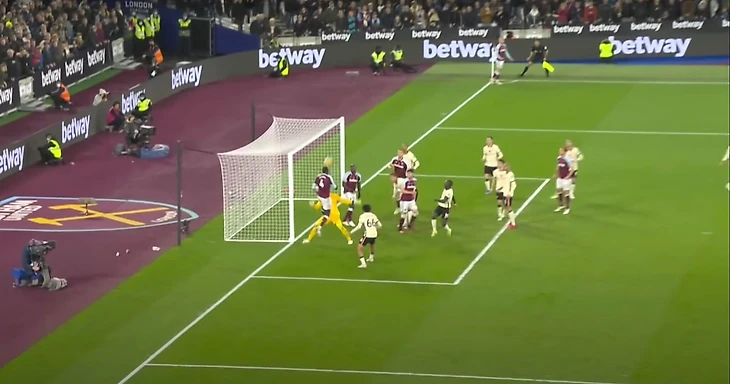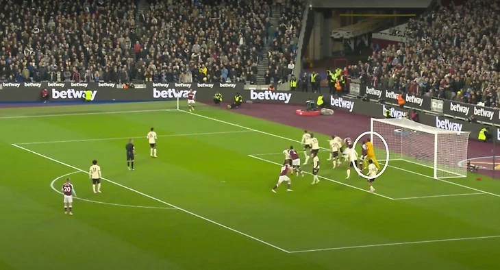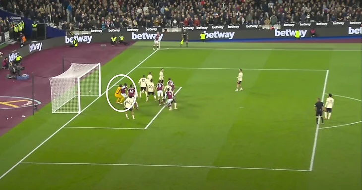 К несчастью для Алиссона, его неуверенность на этом не закончилась. Как только судья дал свисток и Боуэн подал мяч, он сделал еще один маленький шаг к своей ближней стойке и за Антонио, который временно преградил Алиссону путь к мячу. Это был шаг невозврата для Алиссона — тот, который вывел его из своей позиции настолько, что он уже не смог бы качественно добраться до мяча, поданного Боуэном с углового.