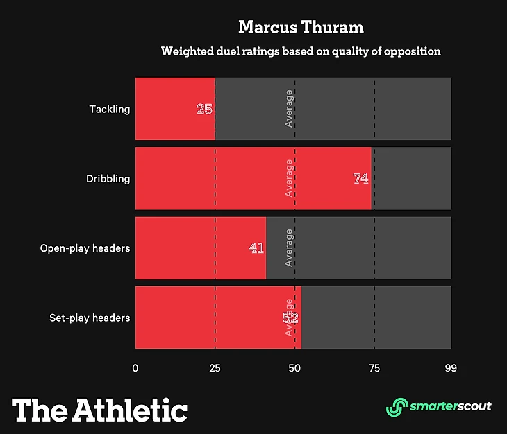 Тюрам опасен с мячом у ног на пространстве. Он играет с поднятой головой и видит неочевидные варианты. Как показывают его рейтинги дуэлей ниже, скорректированые с учетом силы противника, с которым он сталкивался, он значительно выше среднего по своей способности побеждать своего противника (дриблинг: 74 из 99).