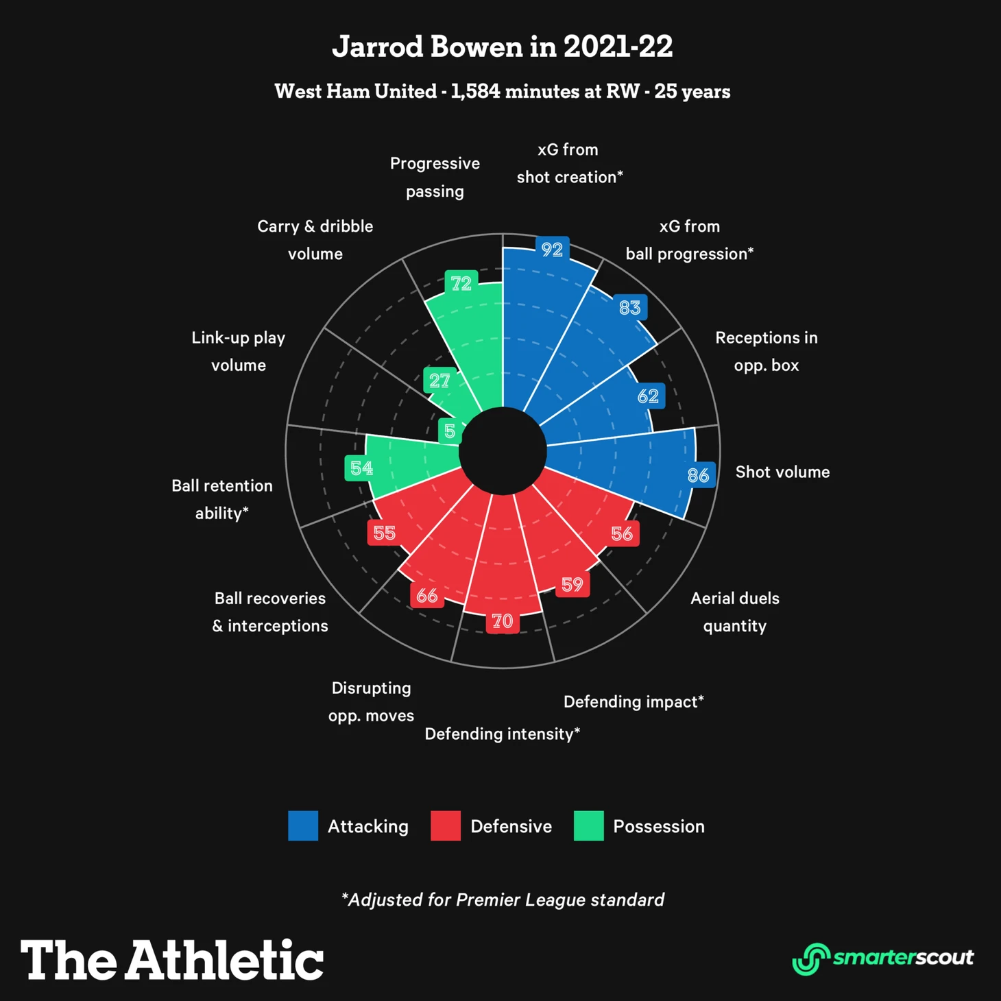 Он уступает только Микаилу Антонио по голам и передачам (как ожидаемым, так и неожиданным) за последние два сезона в клубе восточного Лондона, а также является одним из лидеров команды по получению прогрессивных передач — 6,2 за 90 минут. Данные FBref показывают, что скорость прессинга Боуэна довольно высока для «Вест Хэма», но эти его действия приводят к потере мяча лишь в 22% случаев, что говорит о том, что его энергия не всегда направляется правильно.
