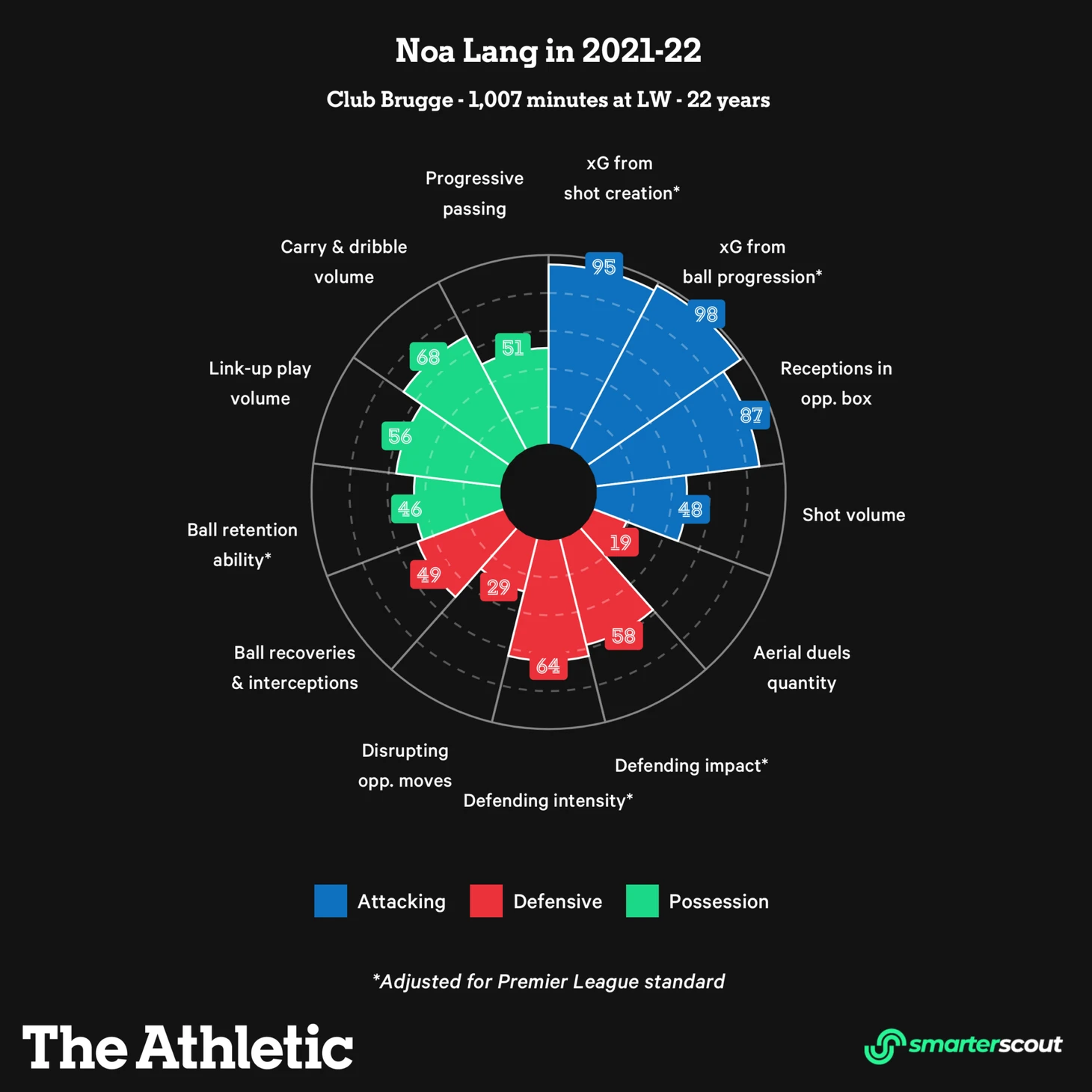 Его xG и xA составляют всего около 70-го процентиля для нападающих, но его показатели как продвигающего мяч игрока и защитника выдающиеся. В роли Мане в «Ливерпуле» он имел бы больше смысла в качестве дриблера, врывающегося в штрафaную прессингующего вингера, а не в роли Жоты.