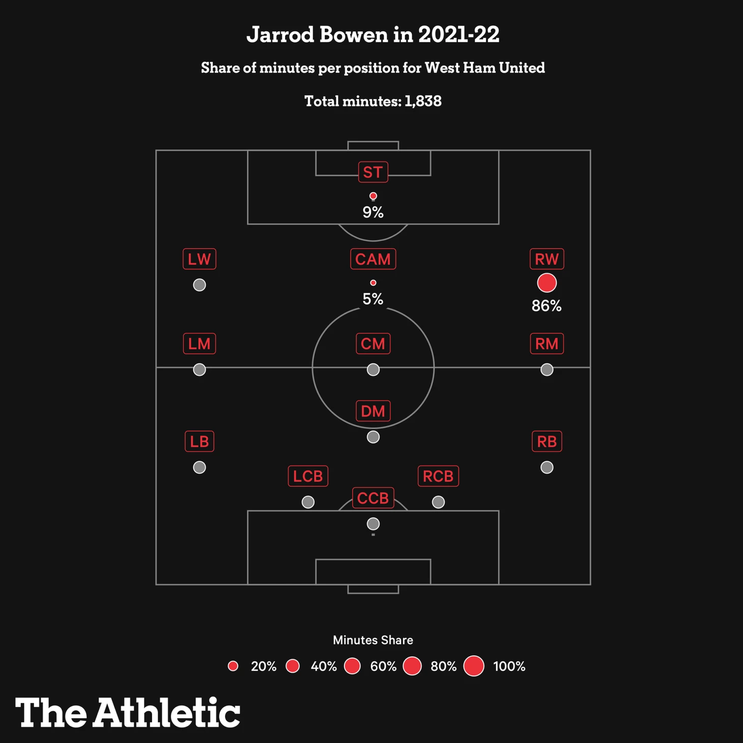 Как видно из приведенного выше графика, Боуэн провел подавляющее большинство своих минут в этом сезоне на правом фланге и любит смещаться оттуда в центр под левую ногу. Одним из важнейших качеств, которым он обладает, является выносливость. В этом сезоне он принял участие во всех 22 матчах Премьер-лиги «Вест Хэма», начав в 21 из них.