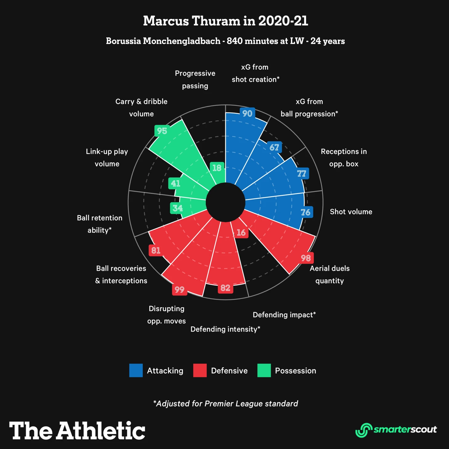 Для серии разумных трансферов The Athletic мы используем данные Smarterscout, отображаемые в «диаграмме пиццы». На приведенных ниже графиках показаны оценки игроков от нуля до 99, относящиеся либо к тому, как часто они выполняют данное стилистическое действие (например, количество ударов за касание), либо к тому, насколько они эффективны в этом (например, насколько хорошо они продвигают мяч вверх по полю) по сравнению с другими, играющими на их позиции.