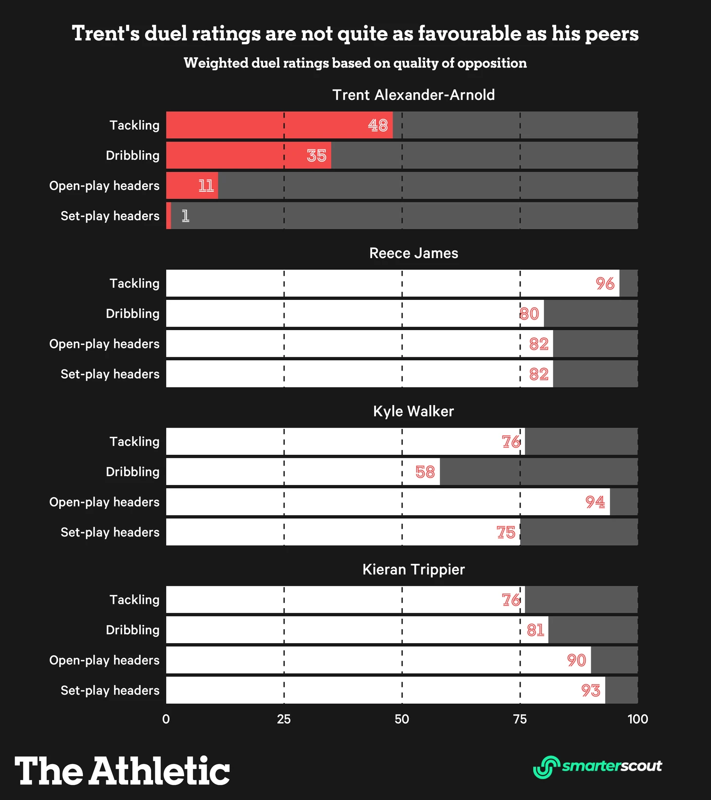 Заинтригованный постоянным шумом вокруг качества в обороне Александер-Арнолда, я решил посмотреть более сотни оборонительных поединков один в один, в которых он участвовал в этом сезоне. Очевидно, что это не научный процесс и охватывает лишь одну область защиты, но мое собственное мнение после просмотра этих роликов заключалось в том, что Александер-Арнолд проиграл в этих поединках больше, чем выиграл.