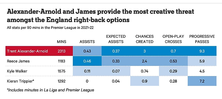 Проникновение — хорошее слово, когда речь заходит о стиле игры Александер-Арнолда — он заставляет вещи происходить. Цифры на приведенной ниже диаграмме показывают, почему он является самым креативным правым защитником Англии, а также подчеркивают, насколько Александер-Арнолд и Джеймс сильно отличаются по сравнению с Уокером и Триппьером.