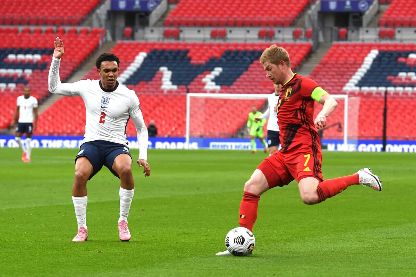 Возможно, единственным случаем, когда Александер-Арнолд выходил в стартовом составе за сборную Англии против высококлассного соперника, и когда Саутгейт также выбрал свою сильнейшую команду, была победа в Лиге наций УЕФА со счетом 2:1 над Бельгией на «Уэмбли» в ноябре 2020 года. В этом случае Уокер (правый центральный защитник) и Триппьер (левый крайний защитник) тоже играли, а Джеймс вышел со скамейки запасных, чтобы позже заменить Александер-Арнолда. Это было то, что можно было бы назвать бинго из правых защитников.