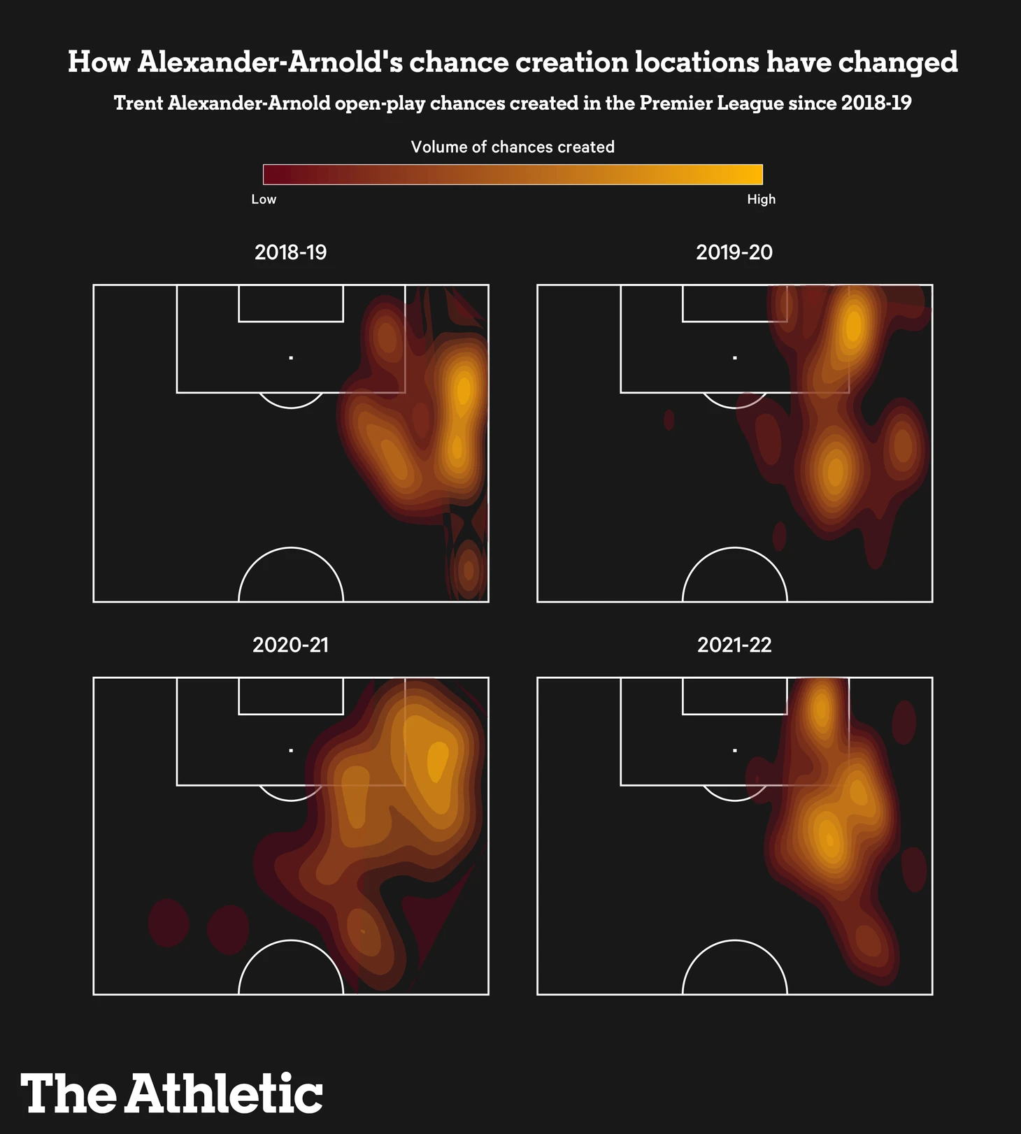 Интересно, что его атакующая угроза в этом сезоне эволюционировала. Было интересно услышать, как Александер-Арнолд недавно объяснял Киве О'Нил из The Athletic, как его игра немного изменилась, позволяя ему смещаться в центр и создавать больше возможностей с игры на позициях по всей «ширине штрафной площади» — то, что иллюстрирует приведенная ниже диаграмма расположения созданных моментов.