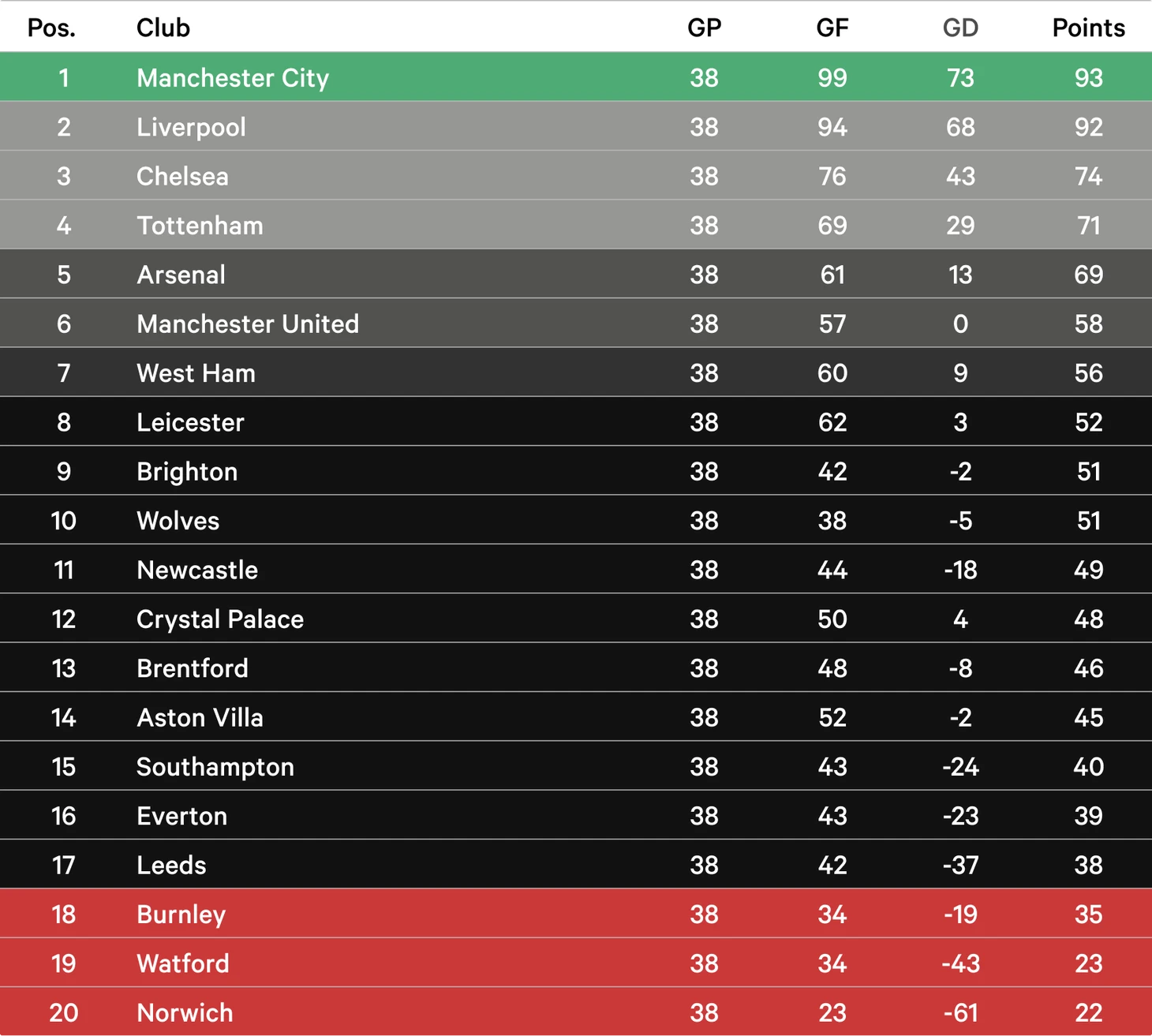 Лишь однажды в истории английского высшего дивизиона команда набрала больше 92 очков, чем «Ливерпуль», и не стала чемпионом — это сделали подопечные Клоппа в сезоне 2018/19. Они имели несчастье столкнуться с противником, обладающим бо́льшими ресурсами. У «Ливерпуля» нет греющих скамейку запасных игроков, купленных за £100 млн..