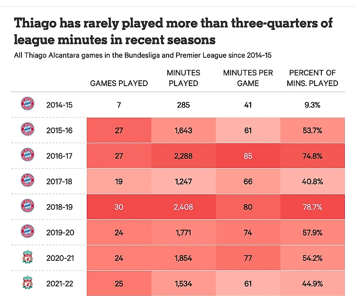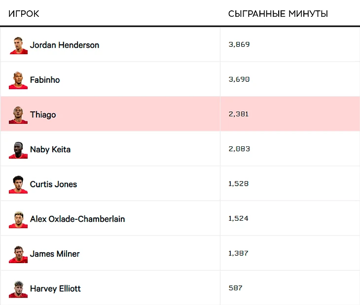 Да, их преследовало какое-то жестокое несчастье, но оно не было полностью непредсказуемым, особенно учитывая то количество матчей, которые ранее пропустили Тияго, Кейта и Окслейд-Чемберлен. В прошлом сезоне Кейта провел за «Ливерпуль» всего 2083 минуты во всех турнирах (Джордан Хендерсон лидировал среди полузащитников с 3869), а Окслейд-Чемберлен сыграл еще меньше (1524).