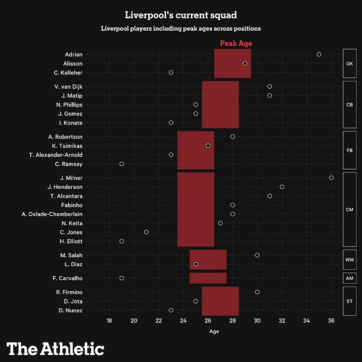Если мы разберем ситуацию по позициям и обратимся к руководству The Athletic [прим.пер.: я его не переводил, но, возможно, стоит] о том, когда игроки на каждой позиции находятся на пике своего мастерства, то с точки зрения вратарей мы увидим, что «Ливерпуль» хорошо сбалансирован.