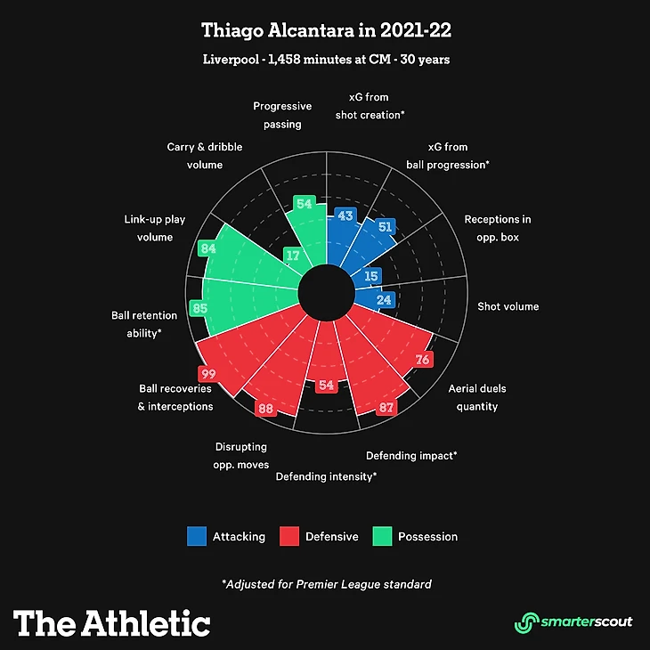 Неудивительно, что Тияго выделяется своим качеством паса. В частности, эти аккуратные и простые передачи (объем связующей игры 84 из 99), а также способность удерживать владение мячом на элитном уровне (способность удерживать мяч 85 из 99). Улучшение Тияго в обороне в игре под руководством Клоппа было впечатляющим. Игрок сборной Испании совершает большое количество действий, не владея мячом (срывает ходы соперника 88 из 99), и делает это с большим эффектом, о чем свидетельствует его рейтинг результативности в защите (87 из 99).