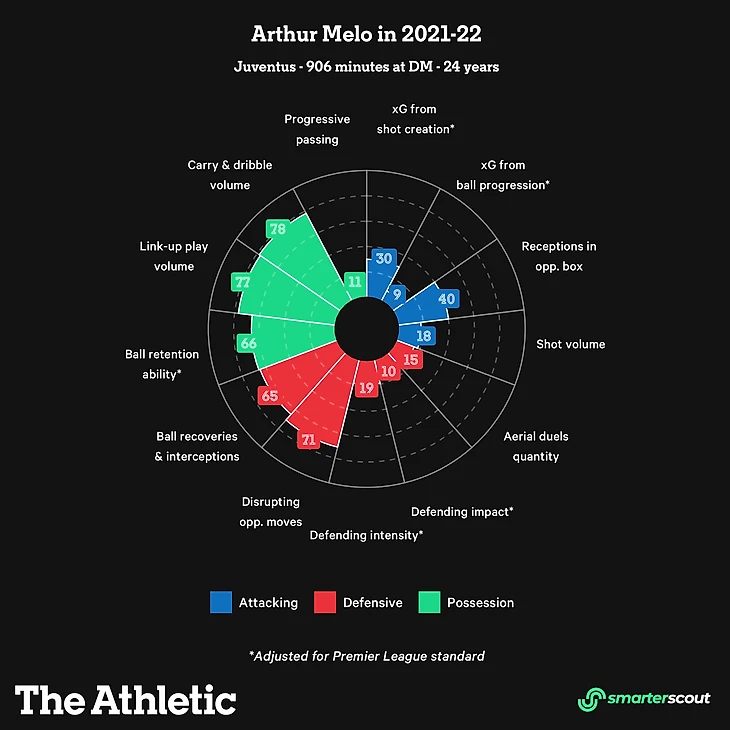 Между тем, Артур также любит, чтобы все шло своим чередом, благодаря аккуратным передачам (объем связующей игры 77 из 99) и умению держать мяч (способность удерживать мяч 66 из 99). Тем не менее, одним из его ключевых качеств является его объем продвижения с мячом и дриблинга (78 из 99), что подчеркивает, что он также гораздо чаще работает с мячом.