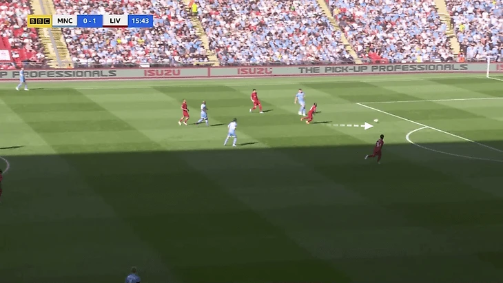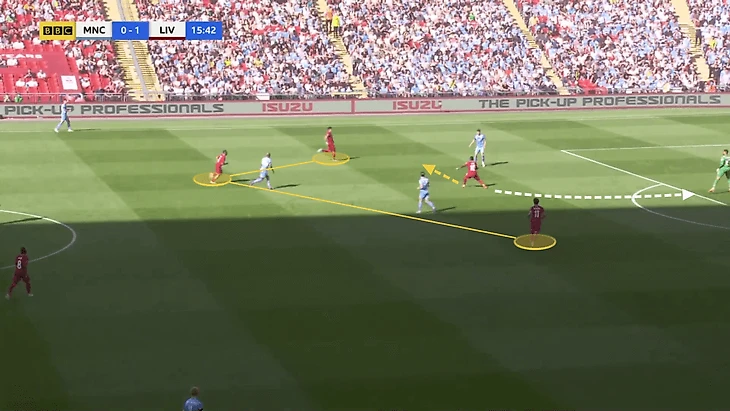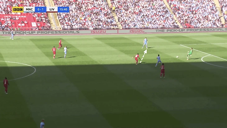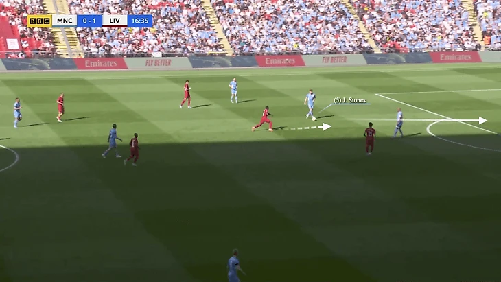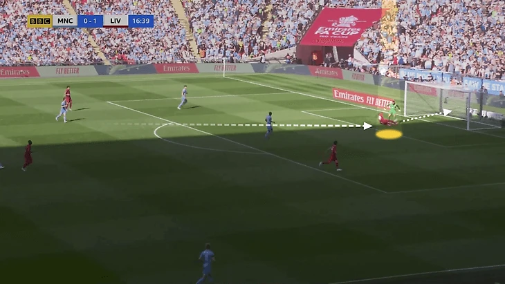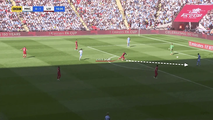 Здесь он встает перед Фернандиньо, чтобы блокировать любой потенциальный пас на полузащитника от Натана Аке, что в конечном итоге приводит к тому, что «Ливерпуль» вынуждает «Сити» играть назад, а Мане является ключом к прессингу и неоднократно бросается на Стоунза, что предвещает окончательный гол.