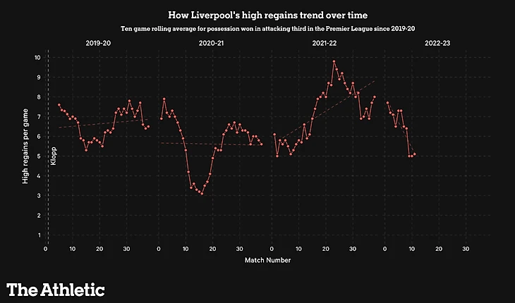 Как показывает приведенная ниже таблица скользящих средних показателей владения мячом за 10 игр, выигранных в атакующей трети, количество случаев, когда «Ливерпуль» делал это, уменьшилось.