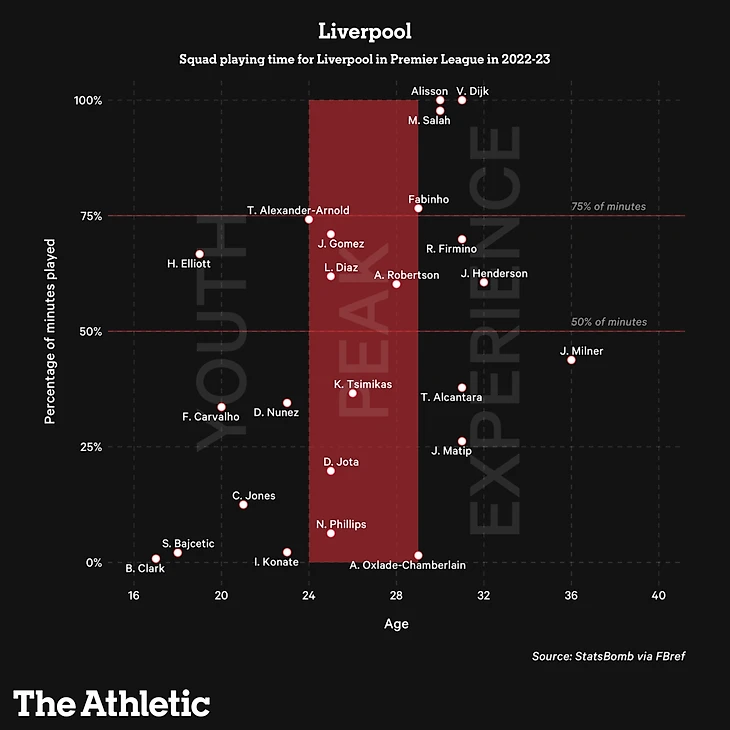 На протяжении всей кампании полузащита «Ливерпуля» пострадала больше всего. У «Ливерпуля» есть опытный костяк в лице Милнера, Хендерсона, Тияго; трио игроков под тридцать — Фабиньо, Окслейд-Чемберлен и Кейта, а также молодое трио из Джонса, Эллиотта и Карвалью.