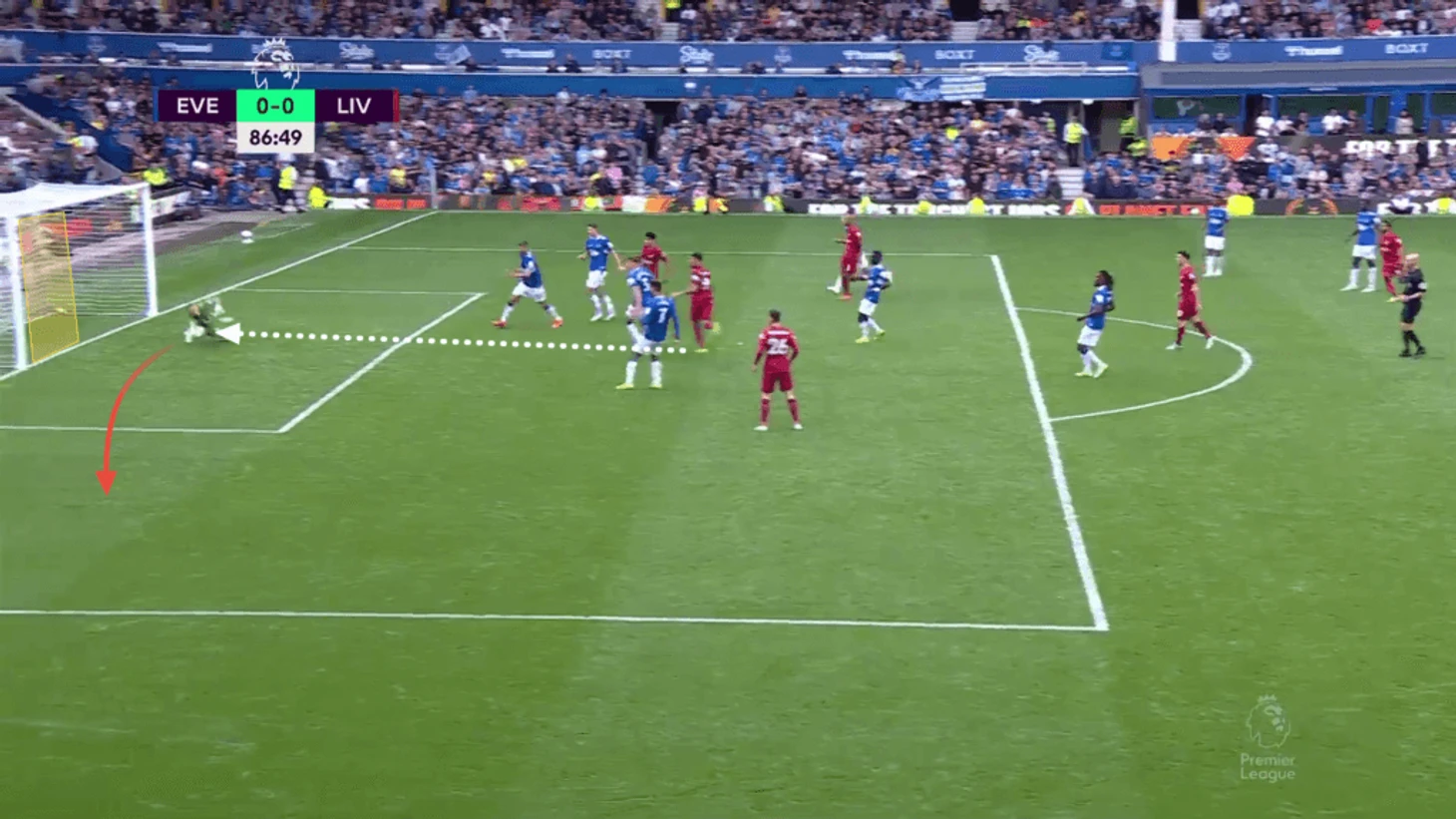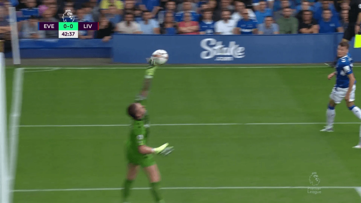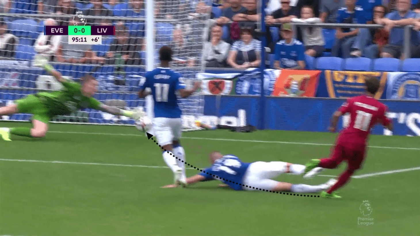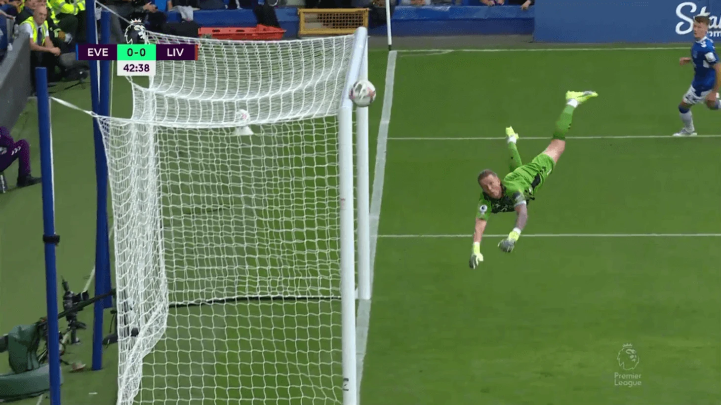 Пробив сразу, Нуньес почти подловил Пикфорда, но тот занял хорошую позицию и продемонстрировал свои акробатические способности.