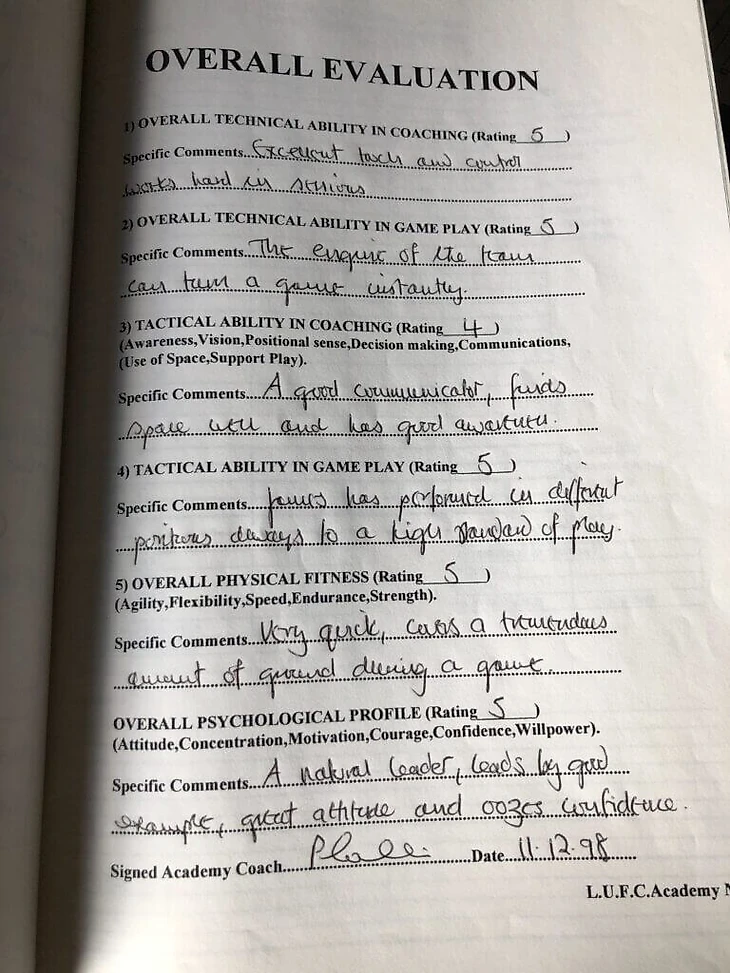 Отчет был заполнен Питом Коллинзом, тренером академии «Лидс Юнайтед», в декабре 1998 года. И если бы вы не знали, какого игрока он оценивал, вы, вероятно, могли бы догадаться.