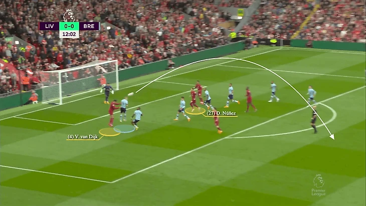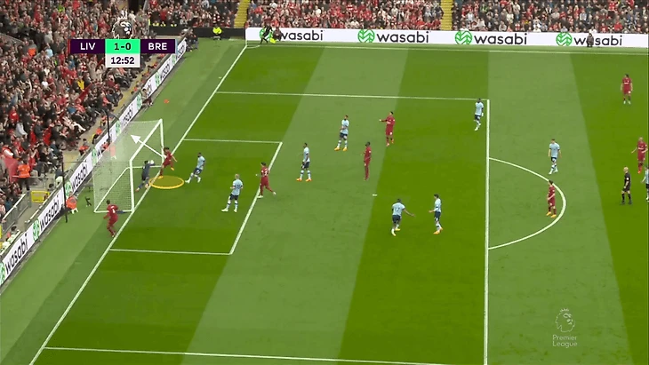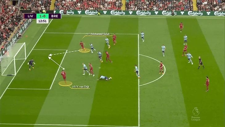 Гол в ворота «Брентфорда» в прошлые выходные похож на этот. После того, как Айвен Тоуни вынес подачу углового от Александера-Арнольда, игроки «Ливерпуля» распределились по штрафной площади, а Ван Дейк, находясь во фланге, выбежал под передачу.