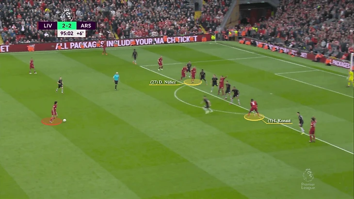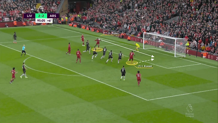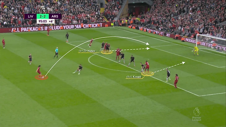 Нуньес — как и Ван Дейк в предыдущем примере — переправляет мяч поперек ворот на набегающего Конате...