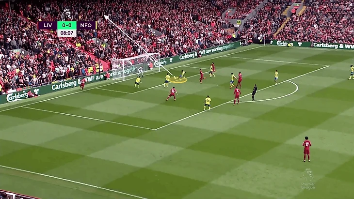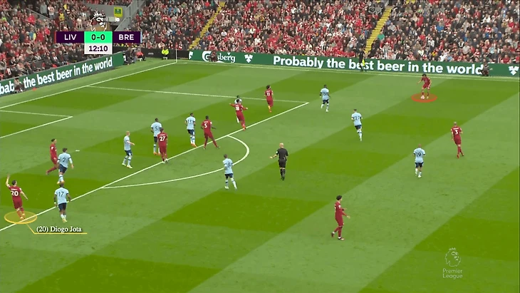 Поскольку «Ливерпуль» дважды возвращает себе мяч, они все еще находятся во второй фазе, и их игроки знают, как действовать: распределяться по штрафной, а Диогу Жота желает получить пас на фланге.