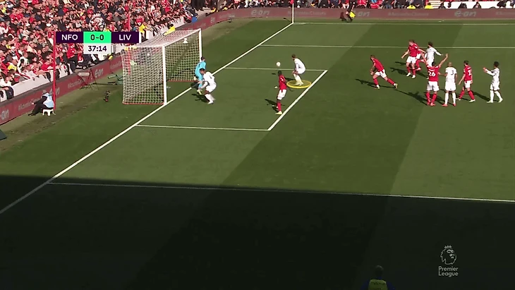 В другом примере против «Форест» 22 апреля самые фланговые игроки «Ливерпуля» с каждой стороны, Салах и Энди Робертсон, выбегают вперед, когда Александер-Арнолд готовится ввести мяч в штрафную после неудачной подачи углового. Правый защитник находит Робертсона, который и выполнял тот угловой, тогда как Салах совершает зеркальный забег на другом фланге.
