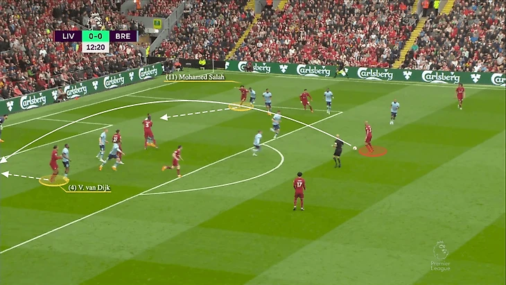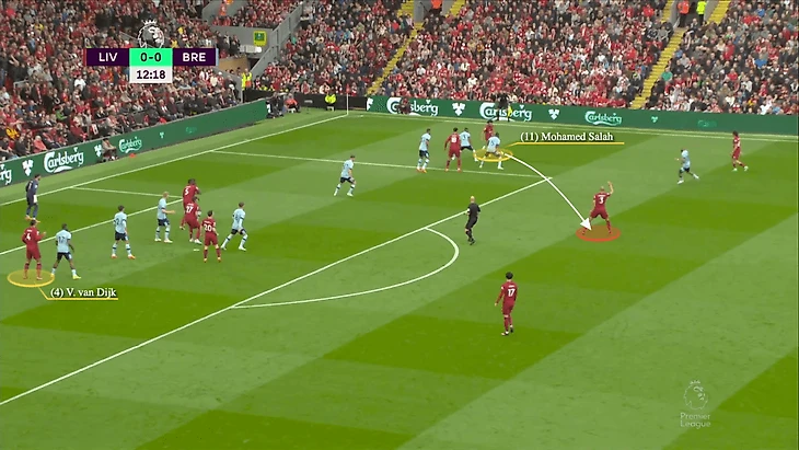 ...и Фабиньо передает мяч центральному защитнику «Ливерпуля», в то время как Салах прорывается за защиту «Брентфорда» с другой стороны.