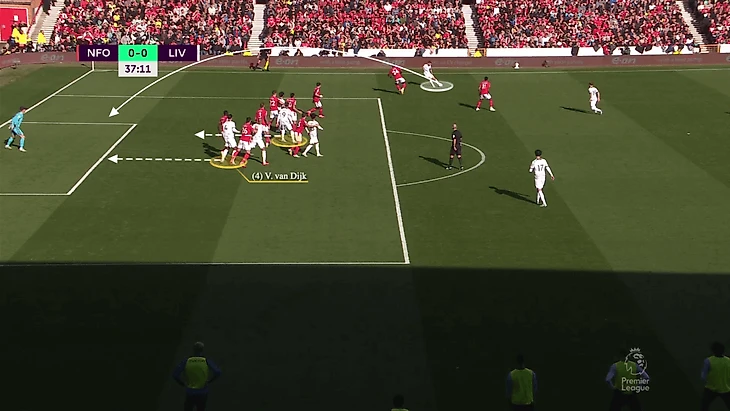 В этом примере против «Ноттингем Форест» 22 октября Джеймс Милнер (в белом) возвращает мяч после подачи углового и нацеливается на Вирджила ван Дейка у дальней штанги, когда Роберто Фирмино делает движение вперед.