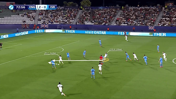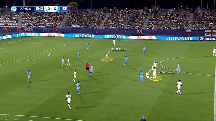 В этом примере против Израиля Джонс продвигается из глубины и получает короткий пас от Оливера Скиппа, в то время как Эллиотт дрейфует в карман пространства.