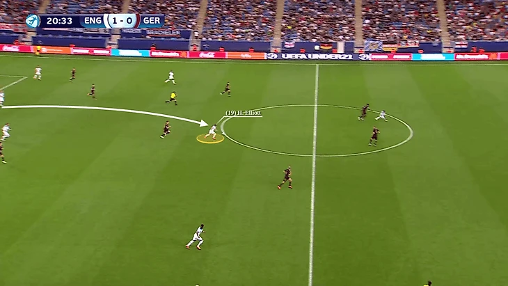 Затем Эллиотт несется на пространство перед ним. Он не самый быстрый игрок, но, что особенно важно, способен вести мяч в хорошем темпе. Мартон Дардай пытается отыграть владение, но не успевает за соперником.