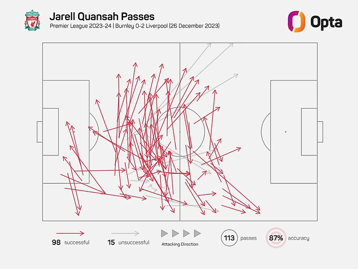 В то время как большинство из них неизбежно приходились на другой фланг к его коллегам-защитникам, также поразительно, что около трети из них закончились на половине поля «Бернли», что говорит о том, что он стремится продвигать мяч вперед, чтобы «Ливерпуль» был впереди, где это возможно.
