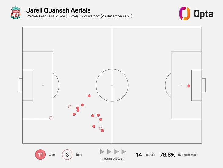 Он доминирует в воздухе — он лишь немного уступает ван Дейку по количеству выигранных воздушных дуэлей за 90 минут в этом сезоне. Против «Бернли» эта сторона его игры снова вышла на первый план, когда он выиграл 11 из 14 воздушных единоборств.