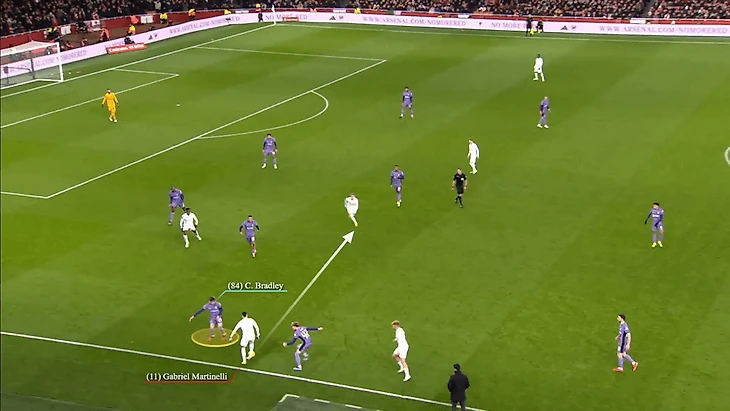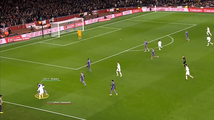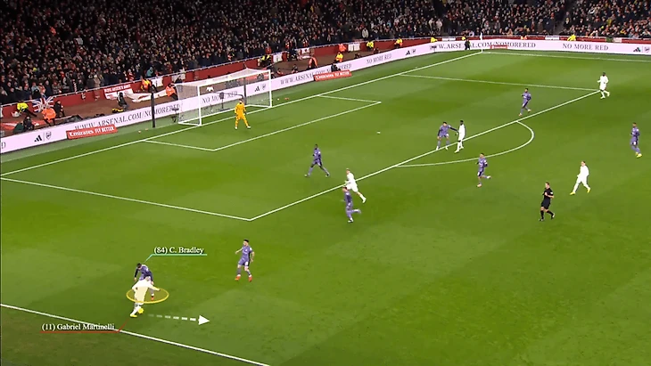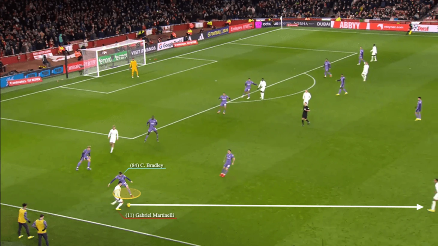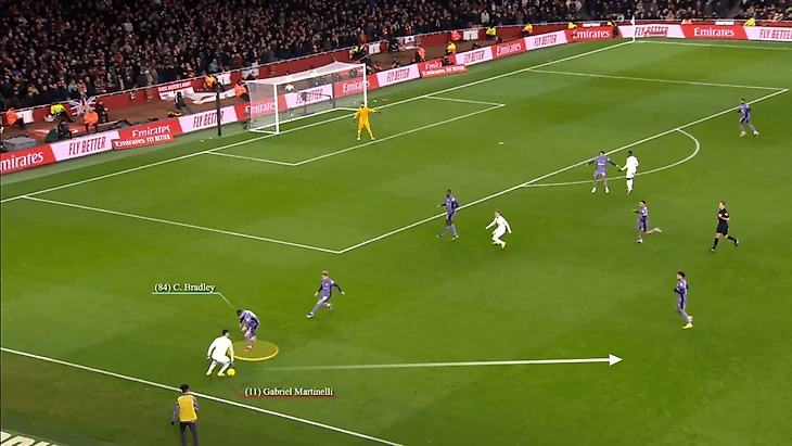Брэдли справился с парой передач верхом, но он особо отличился, когда Мартинелли получил мяч в ноги. У Мартинелли был шанс сразиться с ним еще четыре раза. Он ни разу и не пытался.