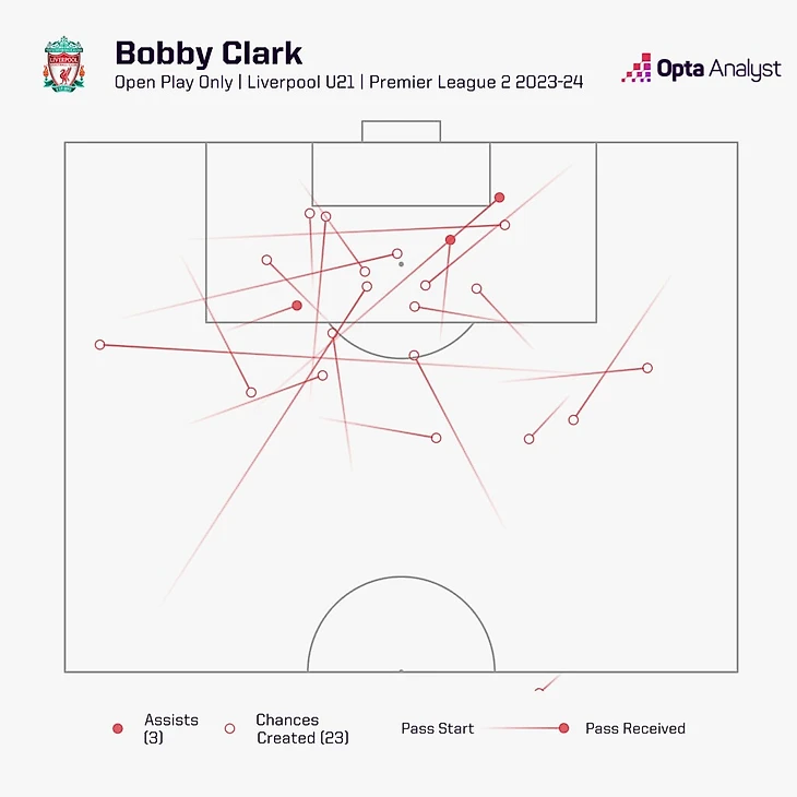 Это уверенный в себе молодой игрок, смелый во владении мячом и постоянная созидательная угроза, отчасти потому, что он всегда старается повлиять на игру в финальной трети. Только Джейми Донли из «Тоттенхэма» (29) создал больше моментов с игры в Премьер-лиге 2 (PL2) в этом сезоне, чем Кларк (23). Порой он может перестараться; он также входит в топ-10 по количеству попыток дриблинга (43), но опускается далеко вниз по успешным дриблингам, завершив только в 12 из них.