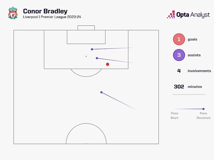 Травма Трента Александер-Арнолда дала Брэдли первый шанс, и он впечатлил голевой передачей в победе над «Борнмутом» со счетом 4:0 в январе. Затем он забил свой первый гол за клуб в победе над «Челси» со счетом 4:1 несколько дней спустя, а также отдал еще две голевые передачи. Его рекорд означает, что среди игроков, сыгравших не менее 300 минут в Премьер-лиге в этом сезоне, только Кевин Де Брюйне (1,35) и Мо Салах (1,21) имеют в среднем больше голевых передач за 90 минут, чем Брэдли (1,19). И помните, что он правый защитник.