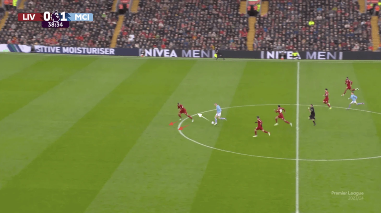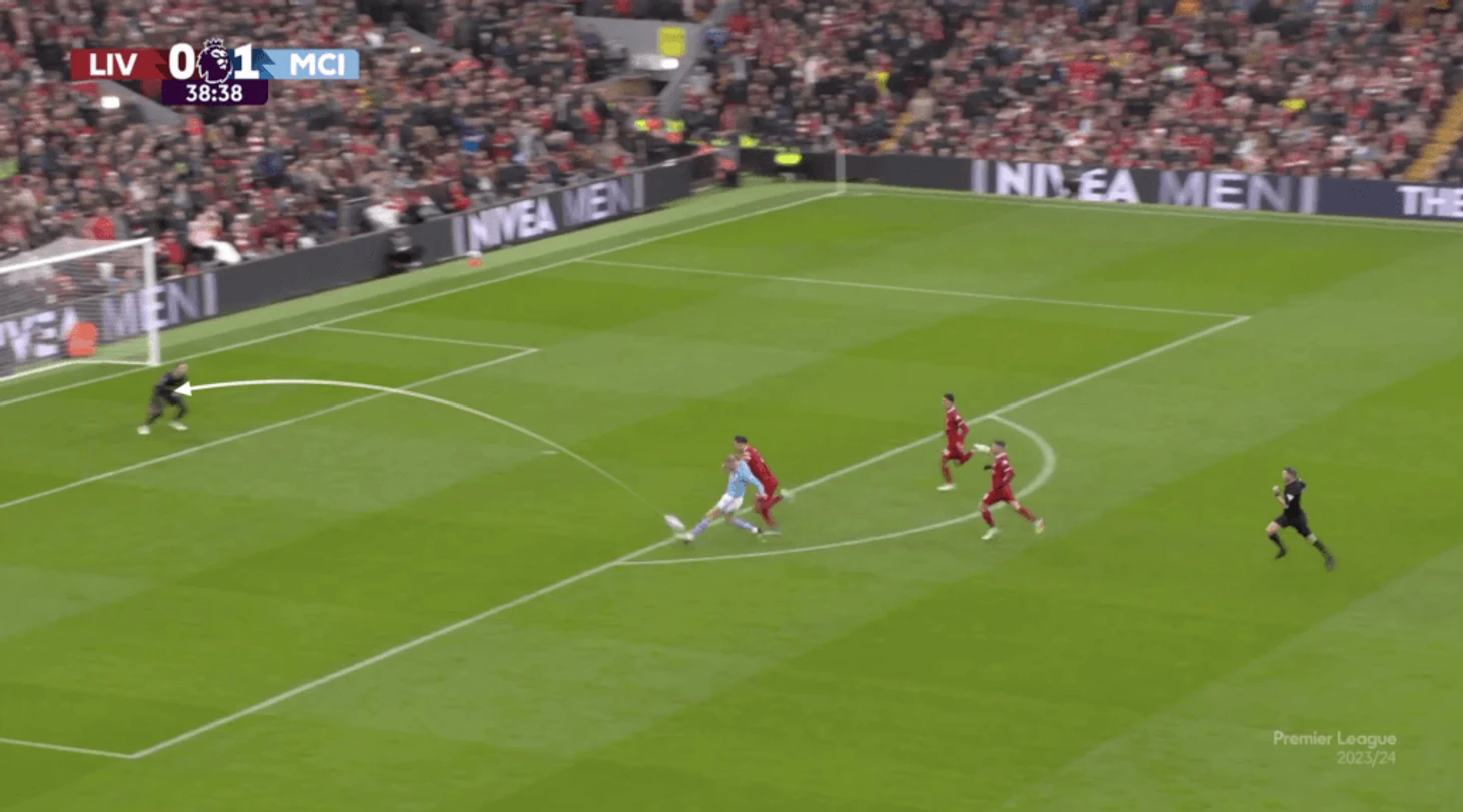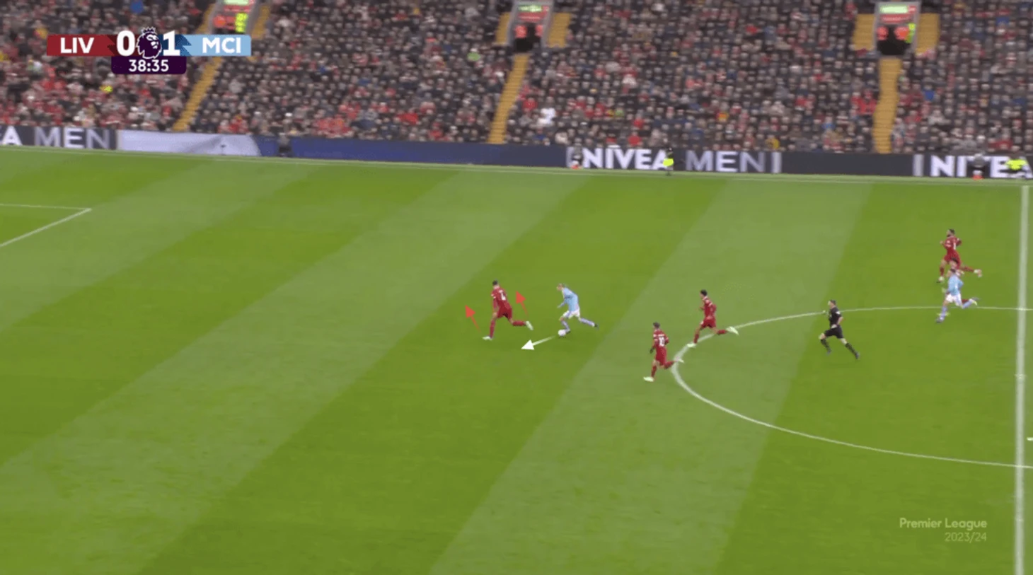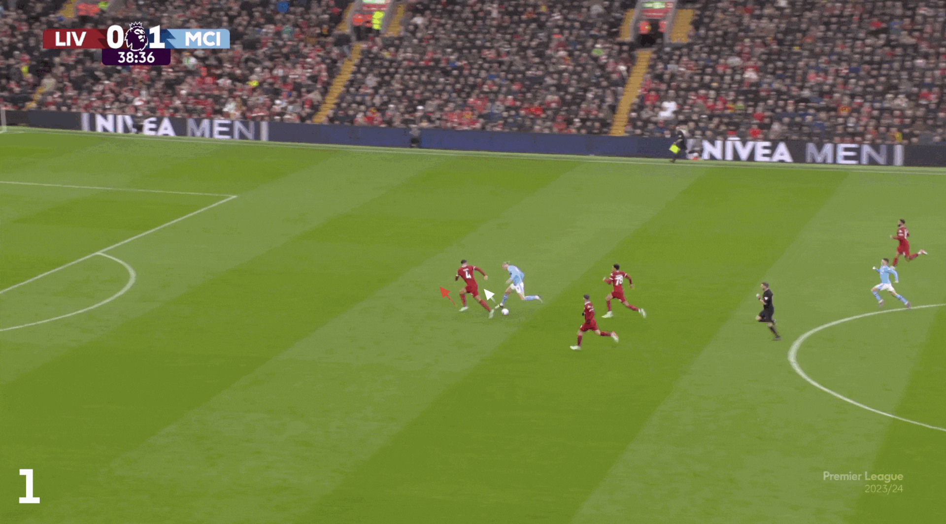 Здесь мы видим тонкое движение в трех кадрах: Холанд проталкивает мяч под ногу ван Дейку и направляется к штрафной.