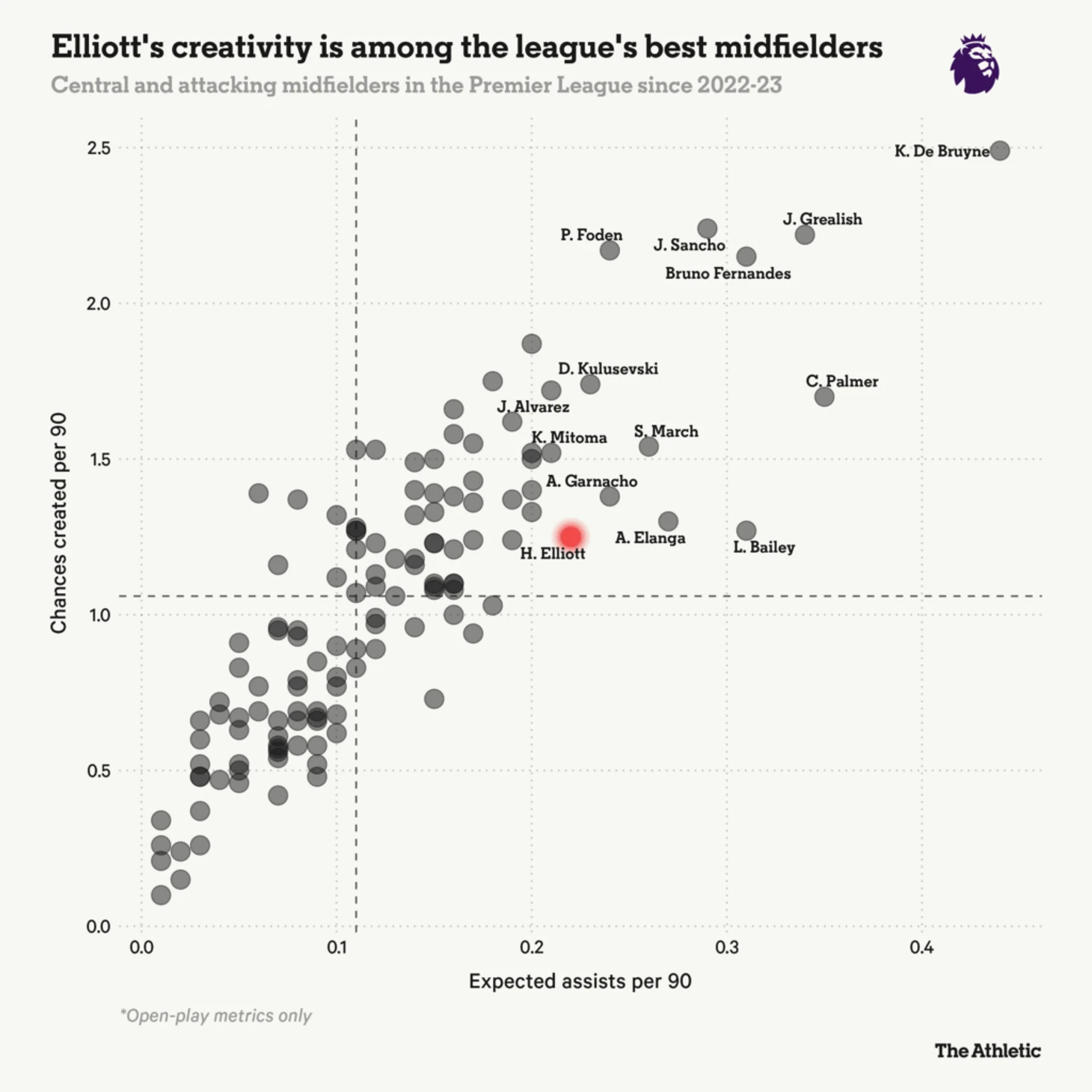 Три гола и семь результативных передач Эллиотта во всех соревнованиях — это еще не все, что можно сказать о нем. Данные по ожидаемым передачам (xA) и созданным шансам с игры за 90 минут показывают, что он был одним из самых креативных полузащитников в Премьер-лиге за последние пару сезонов.