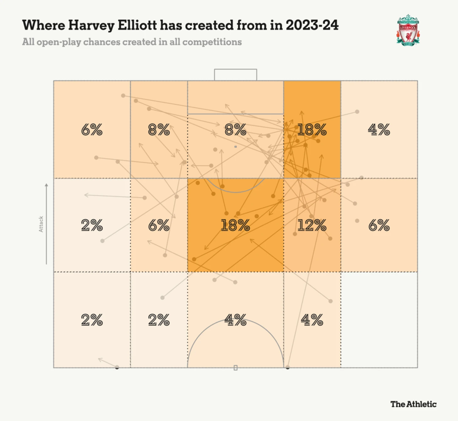 Учитывая, что его навыки идеально подходят для игры на позиции »десятки», неудивительно, что Эллиотт проявляет себя наиболее креативно, когда действует в зоне, которую аналитики называют «зоной 14» — область в центре поля сразу за пределами штрафной площади.