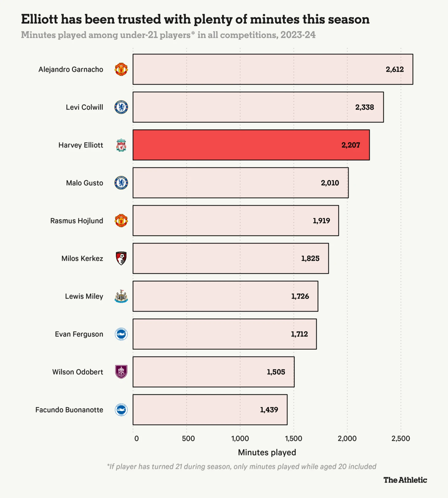 Единственными игроками Премьер-лиги в возрасте до 21 года, которые сыграли больше во всех соревнованиях за клуб в 2023/24 годах, являются Алехандро Гарначо из «Манчестер Юнайтед» (2 612) и Леви Колвилл из «Челси» (2 338).