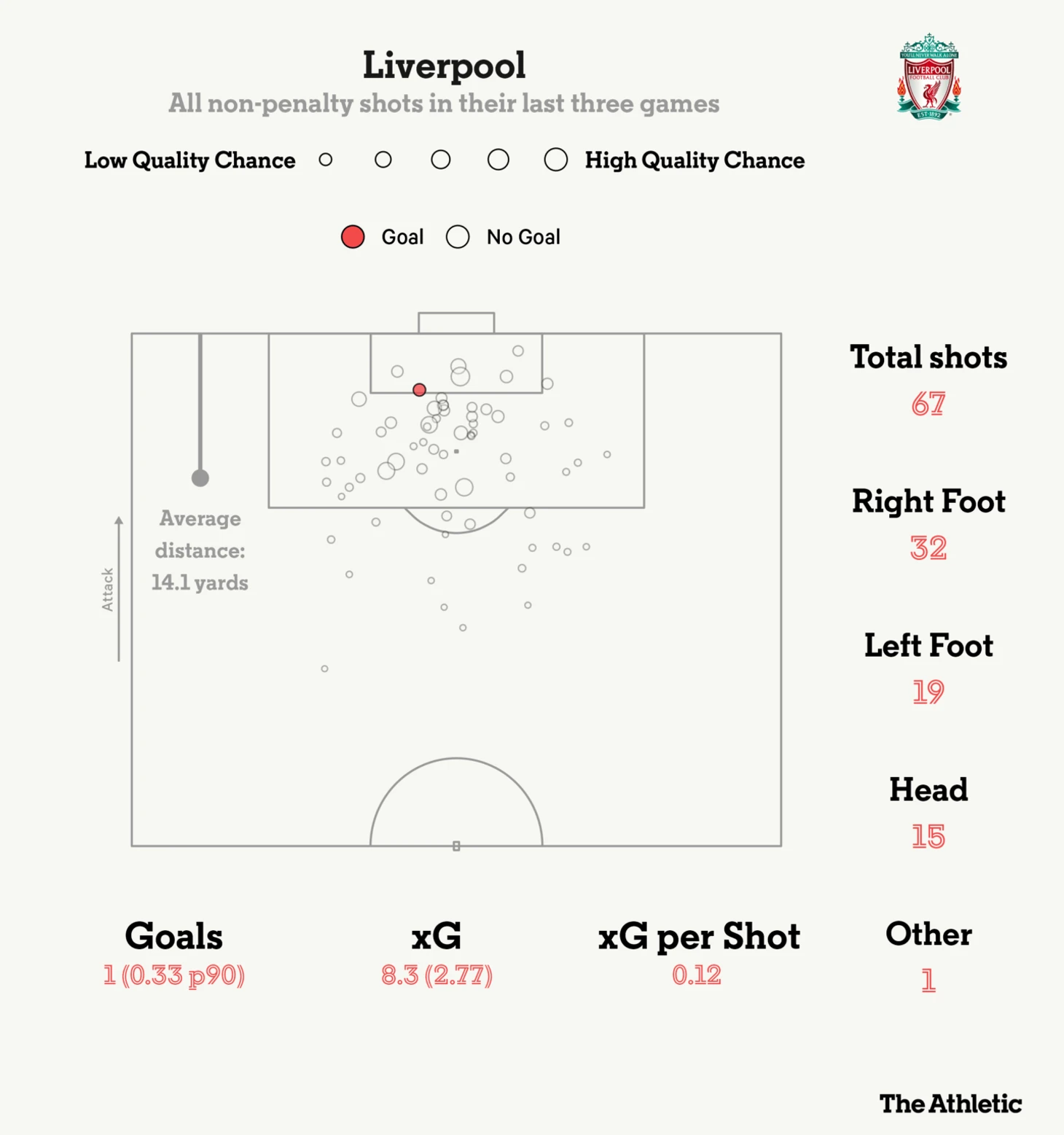 В последних трех матчах «Ливерпуль» нанес 67 ударов по воротам, но забил только два гола, один из которых с пенальти, при тотале ожидаемых голов (xG) 8,3. Карту ударов в этих матчах вы можете увидеть ниже.