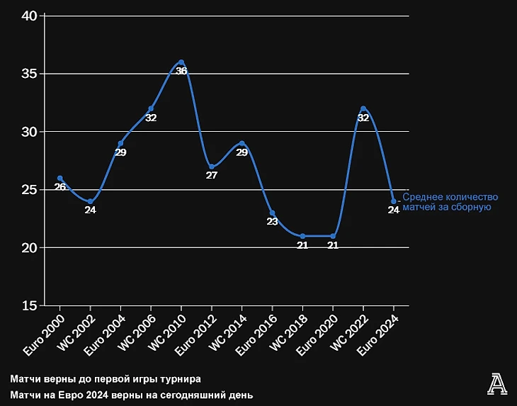 Среднее количество матчей в 12 последних составах сборной Англии на крупных турнирах