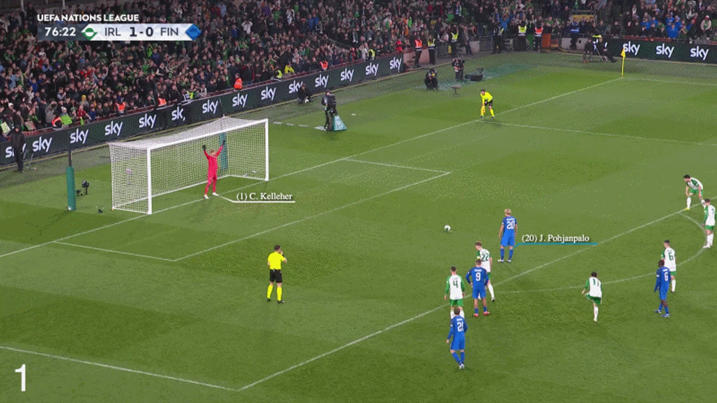 В матче с Финляндией ему не пришлось далеко двигаться, чтобы остановить удар Похьянпало, который пробил по центру. Но можно отчетливо видеть, как Келлехер делает антигравитационный наклон вперед в стиле Smooth Criminal, чтобы убедиться, что вес его тела уже смещается, прежде чем он выберет, в какую сторону прыгать.