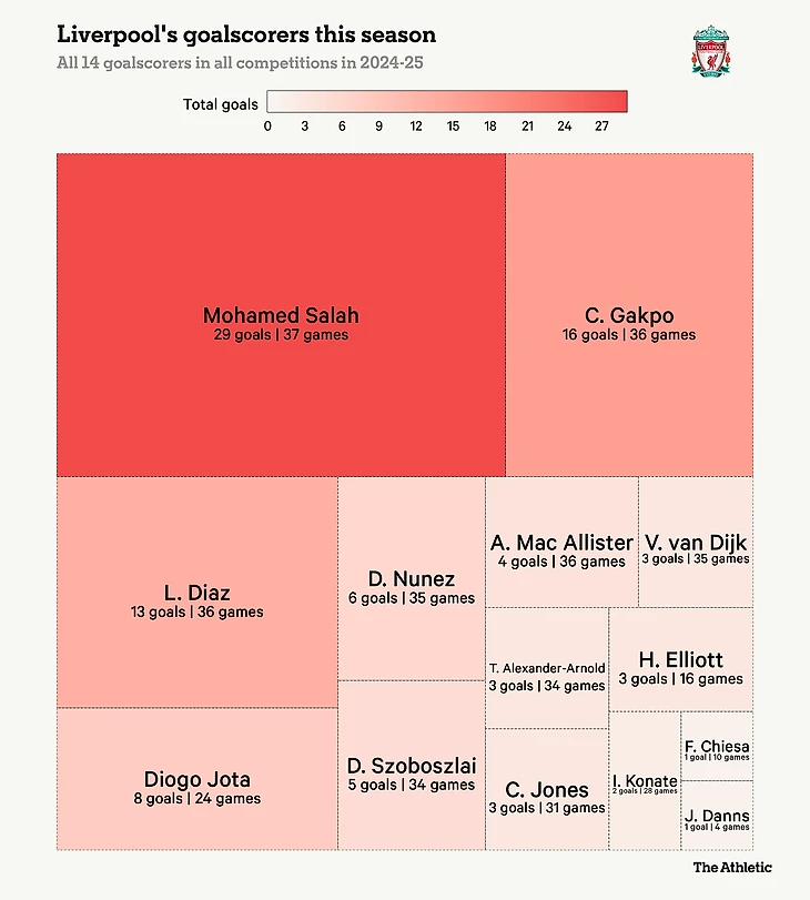 Помимо Салаха, большая часть из 101 голов «Ливерпуля» во всех соревнованиях пришлась на долю всей передней линии: Диас, Коди Гакпо и Диогу Жота выступают в роли ключевых игроков поддержки. Тем не менее, Слот должен быть доволен тем, что в последние недели его полузащитники забили немало голов — в частности, Мак Аллистер и Собослаи, которые в среду вечером отметились голами, а Салах, наконец-то, остался недоволен (хотя и сделал свой обычный голевой пас).