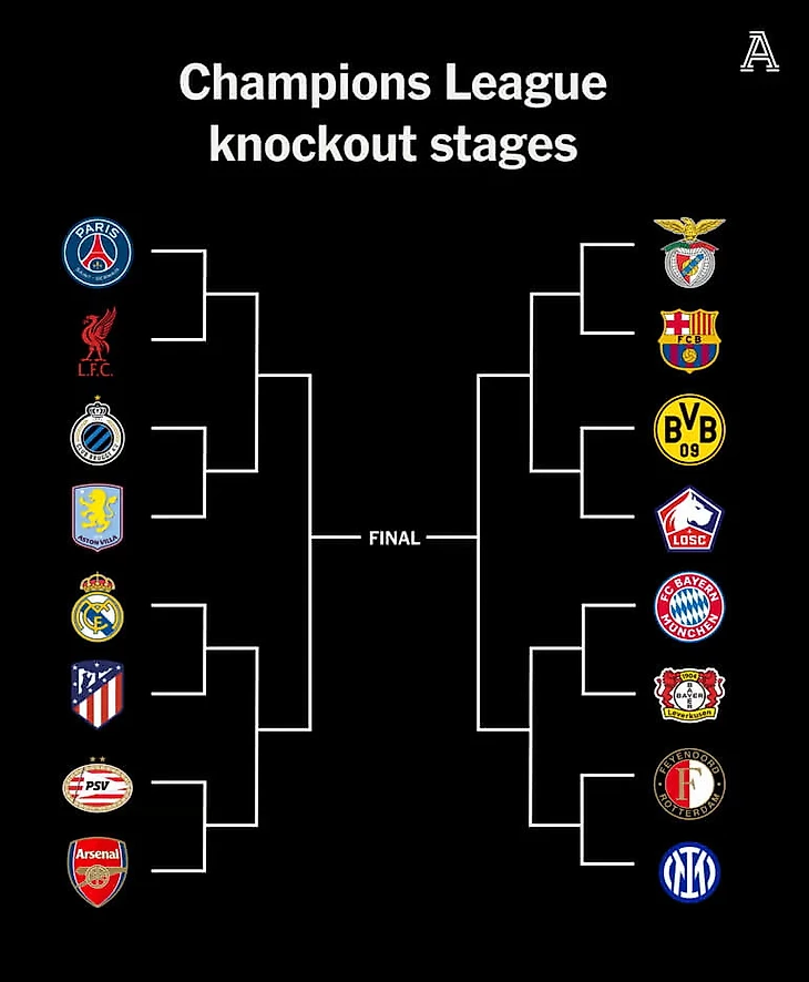 «Астон Вилла», занявшая восьмое место, попала в пару к клубу «Брюгге», который до прошлого месяца ни разу не побеждал в плей-офф Лиги чемпионов. «Барселона» сыграет с «Бенфикой», «Арсенал», занявший третье место, примет ПСВ, а «Интер», занявший четвертое место, сразится с «Фейеноордом».
