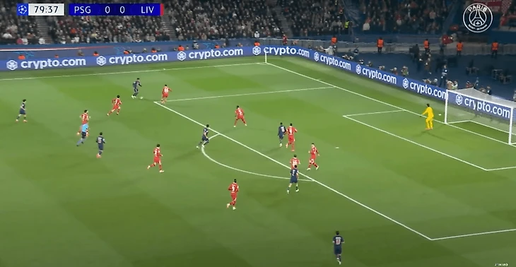 Затем, за долю секунды, Кварацхелия великолепно пробирается между двумя защитниками, смещается в центр и проталкивает мяч справа от себя. Внезапно он оказывается один в один с Ибраимой Конате.