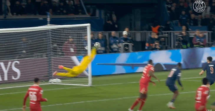 Когда мяч слегка отрикошетил от ноги Конате и понесся обратно в том направлении, откуда он только что пришел, вратарь отреагировал великолепно — уперся левой ногой в землю, чтобы восстановить равновесие, вернуть позицию и создать силу, необходимую для изменения направления и броска к мячу.