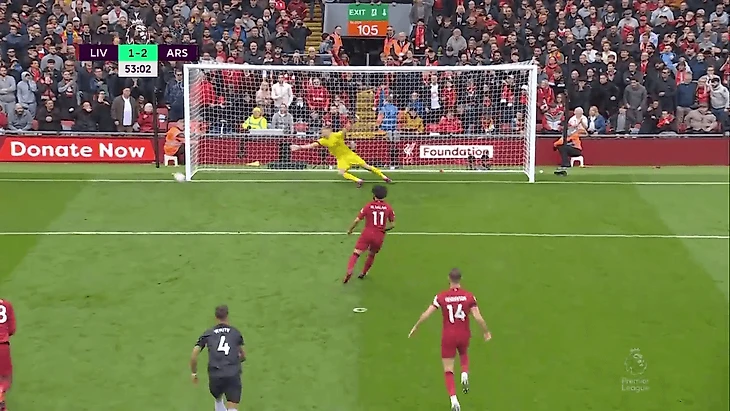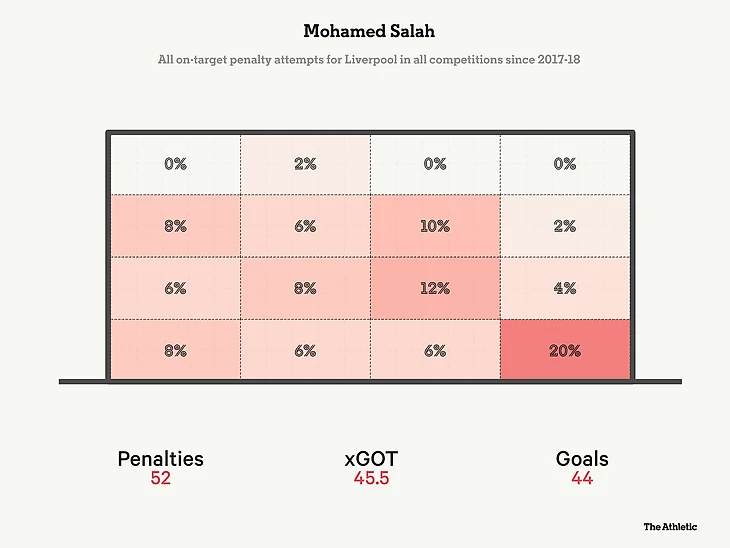 Это один из трех пенальти, пробитых Салахом за «Ливерпуль», которые не попали в ворота — и все они были пробиты в право от вратаря.